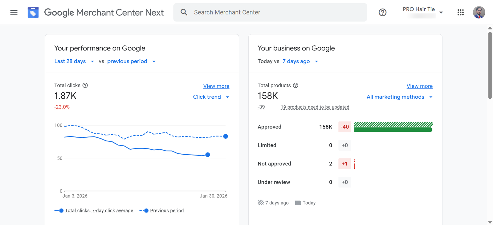 ⚡ The Execution (The Recovery Process) Merchant Center Next Setup: Migrated and configured the latest Google Merchant Center Next interface for streamlined product management. Catalog Health Management: Successfully maintained 158,000 approved products, ensuring maximum visibility across Google’s ecosystem. Issue Resolution: Actively identified and addressed the small percentage of “Not Approved” items (only 2 out of 158K) to maintain a near-perfect account health score. Performance Monitoring: Tracked click trends and performance data directly within GMC to align product feed changes with actual traffic results.