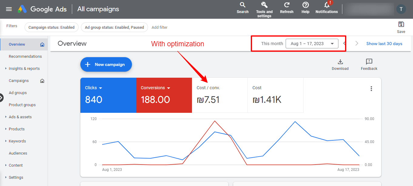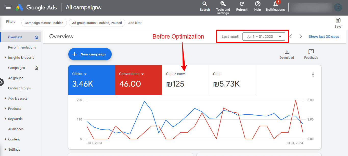 🔍 The Examination (The “Before” State) In July, the account was burning budget with very low efficiency. With a total spend of ₪5.73K, the campaigns generated only 46 conversions. This resulted in a high Cost/conv. of ₪125, making the account difficult to scale profitably. The traffic volume was high (3.46K clicks), but the conversion intent was clearly missing.